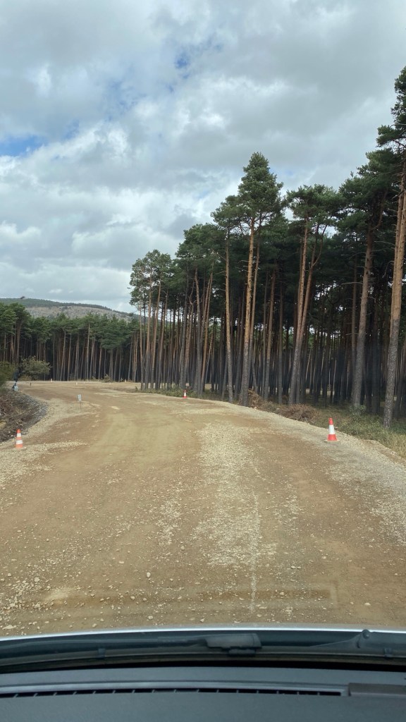 El asfalto ahora se convierte en una carretera cuyo firme es irregular, entramos en una zona de obras, bosques a ambos lados, aquí la industria maderera debe ser muy relevante, vemos bastantes grupos de troncos cortados a la misma medida amontonados a ambos lados.
