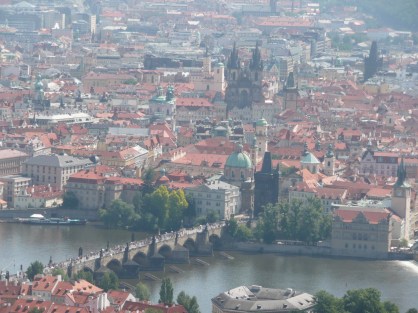 Llegamos a la Torre de Petřín, que es una copia en pequeño de la Torre Eiffel de París. 299 escalones y llegamos arriba, ufff!!! Praga está bajo nuestra atenta mirada, el cielo está bastante despejado y el calor hoy no es tan asfixiante como en los días anteriores.