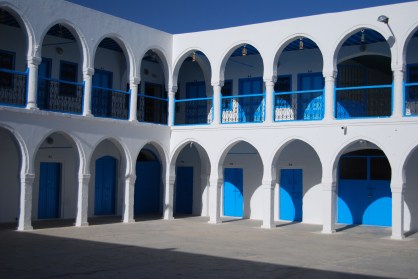 Siguiente parada en la sinagoga de La Ghriba. pasamos por un detector de metales antes de entrar, posteriormente Imed nos explica que hace unos años, hubo un tunecino que se estrelló con su coche bomba matando a un guía local y dos alemanes. Desde entonces, hay policías fijos a pesar de que éste ha sido el único incidente que ha habido en Túnez en estas circunstancias.