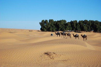 Ya ha oscurecido y finalmente, en el medio de la nada aparece un oasis cuyo nombre es Ksar Ghilane donde dormiremos en una jaima. La verdad es que el suplemento que hemos pagado para estar en un campamento mejor ha sido importante pero, ha valido la pena porque los pobres que no lo han hecho, han tenido que dormir en una tienda de seis personas, con lavabos y duchas fuera y sin toallas… mientras que nosotros lo hemos hecho con calefacción incluida.