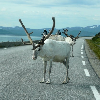 Desayuno de nuevo con fruta que había desaparecido desde hace varios días y en la carretera E75. Seguimos en la zona de los renos y de nuevo se nos cruzan unos cuantos, consigo hacer foto a uno blanco sin moverme del asiento.