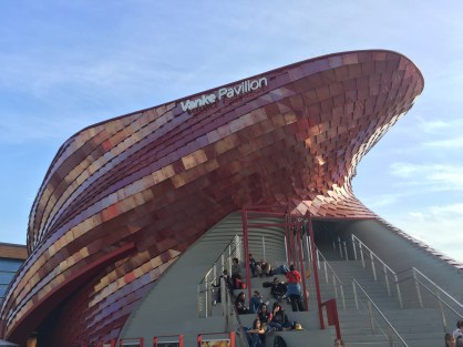 Habíamos dejado para hoy el pabellón de EAU donde las colas también en agosto eran de mas de dos horas pensando que hoy sería mucho más rápido, el resultado ha sido una cola de dos horas y media, el pabellón está construido con un material especial que a simple vista parece cómo montañas de arena, en realidad está fabricado con un compuesto que aísla la calor exterior con el interior, nos explican que el pabellón entero vendrá desmontado por completo y vuelto a montar en Dubai donde se celebrará la EXPO del 2020. Audiovisuales, una película que narra la historia de este país donde le sobra la energía y le falta el agua.