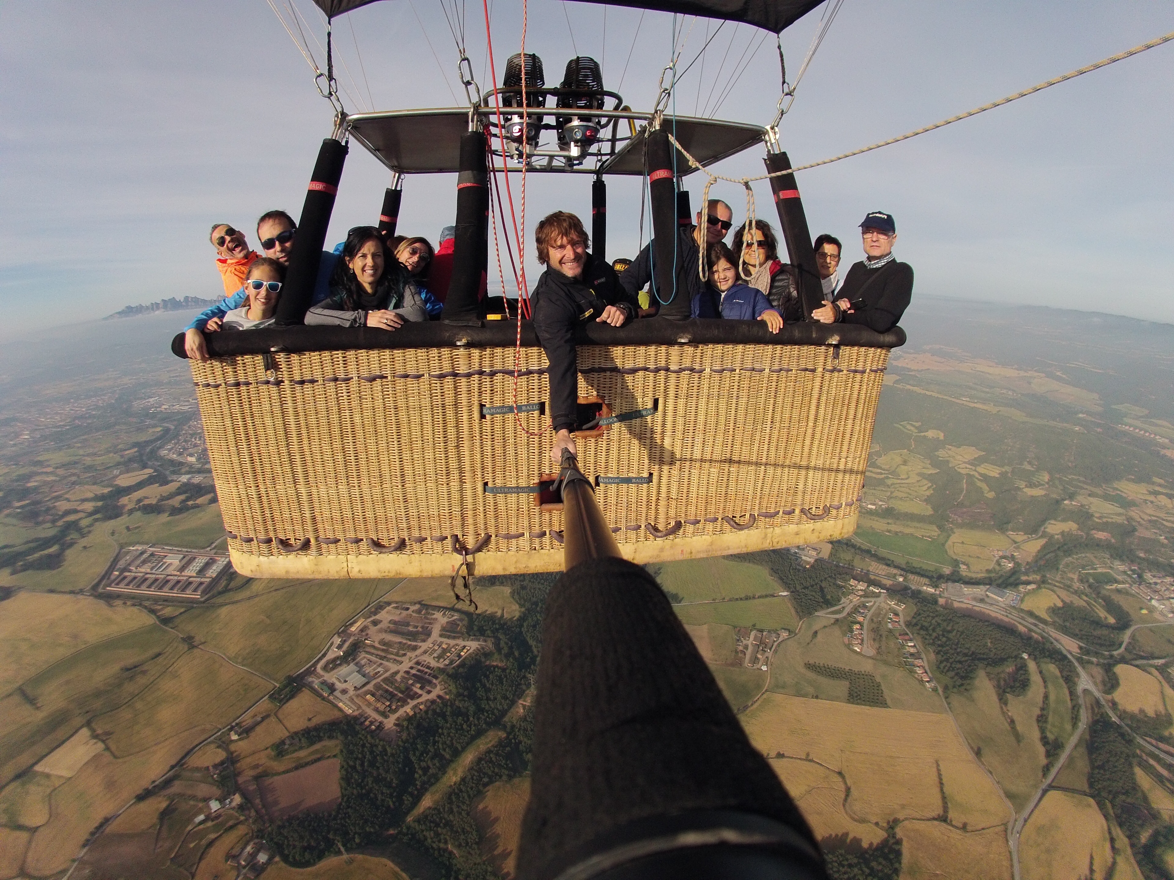 Todos a bordo, listos, despegamos en un plis y subimos rápidamente como si nada, la cesta es muy estable, no se nota para nada la sensación de vacío. Parece mentira que ya estamos volando. La temperatura es algo baja pero no hace frío, todos llevamos cortaviento, hay sol, la niebla deja ver a lo lejos la parte más alta de la montaña de Montserrat. Se respira paz.