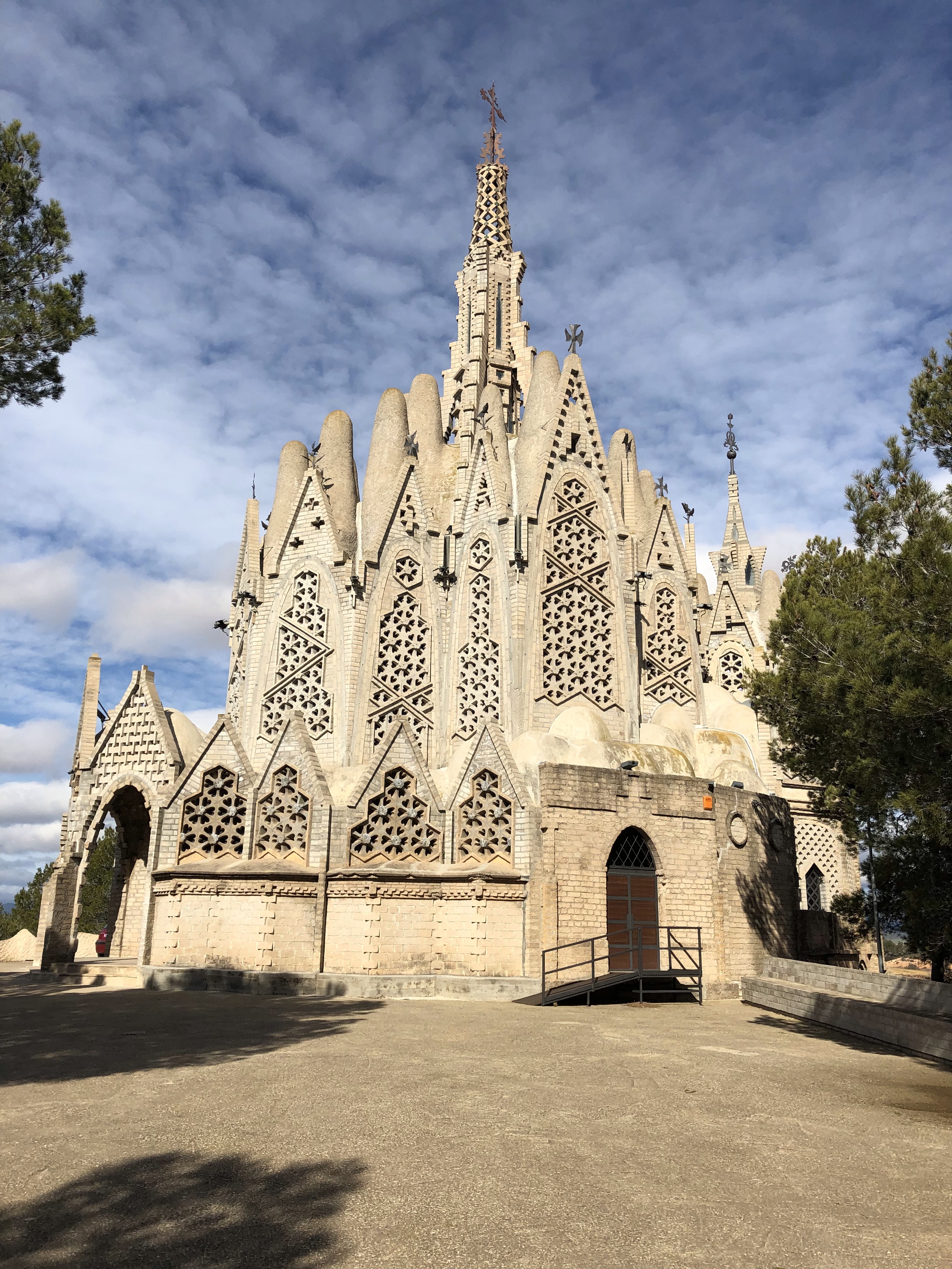 El edificio está ubicado en lo alto de una pequeña colina, sus formas con puntas redondeadas recuerdan mucho las de la montaña de Montserrat, por dentro está formado por arcos parabólicos, la planta tiene forma barco orientado hacia Montserrat por un lado y el pueblo de Monferri por el otro, hay varias vidrieras de distintos colores, la parte central tiene una altura de 27m. Hay una escalera en cada lado donde se puede subir para ver una reproducción de «la Moreneta», recorrido que hacemos mientras la señora sigue con sus explicaciones antes de que todo el inserso haga lo mismo.
