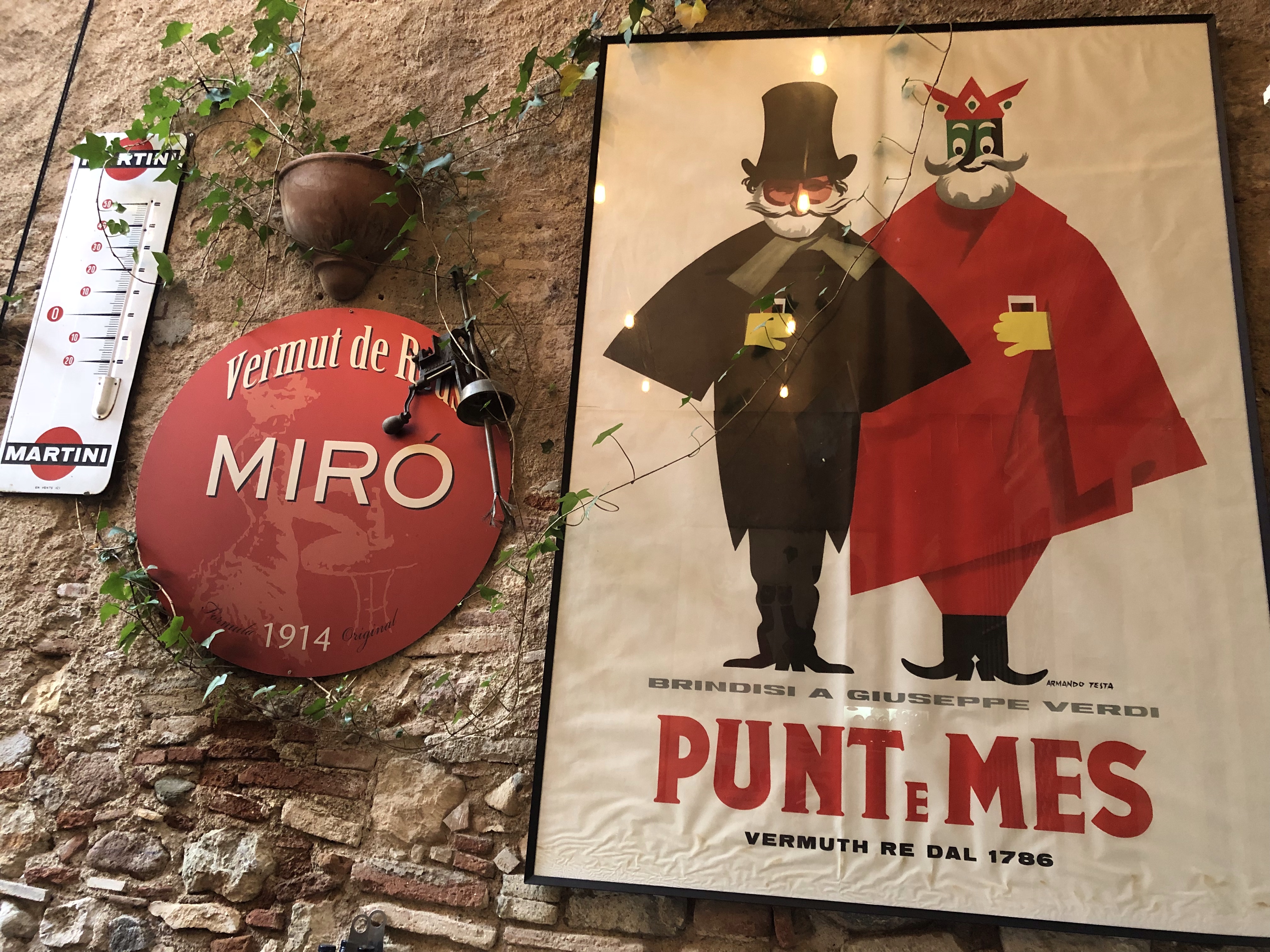 Hora del vermut, pues allí que vamos, al «Museu del Vermut» (http://www.museudelvermut.com/es/carta/), se trata de un local enorme donde obviamente la gente va a tomar un vermut y también a comer. Entramos, en la planta baja hay tres zonas separadas, una con la barra y mesas con taburetes, la terraza con mesas donde nos sentamos y la parte del restaurante. Nos tomamos nuestro vermut y luego leyendo la carta decidimos quedarnos a comer, decisión muy acertada, comida muy buena a un precio correcto. Una vez acabado de comer por turnos subimos a la primera planta donde a parte de los lavabos hay varias salas privadas. Todo el local está lleno de pósters encuadrados de todos los vermuts del mundo, en una pantalla se puede ver la historia del vermut a lo largo de los siglos, lo que yo no sabía era que el vermut se ha inventado en Italia para luego exportarlo al resto del mundo.