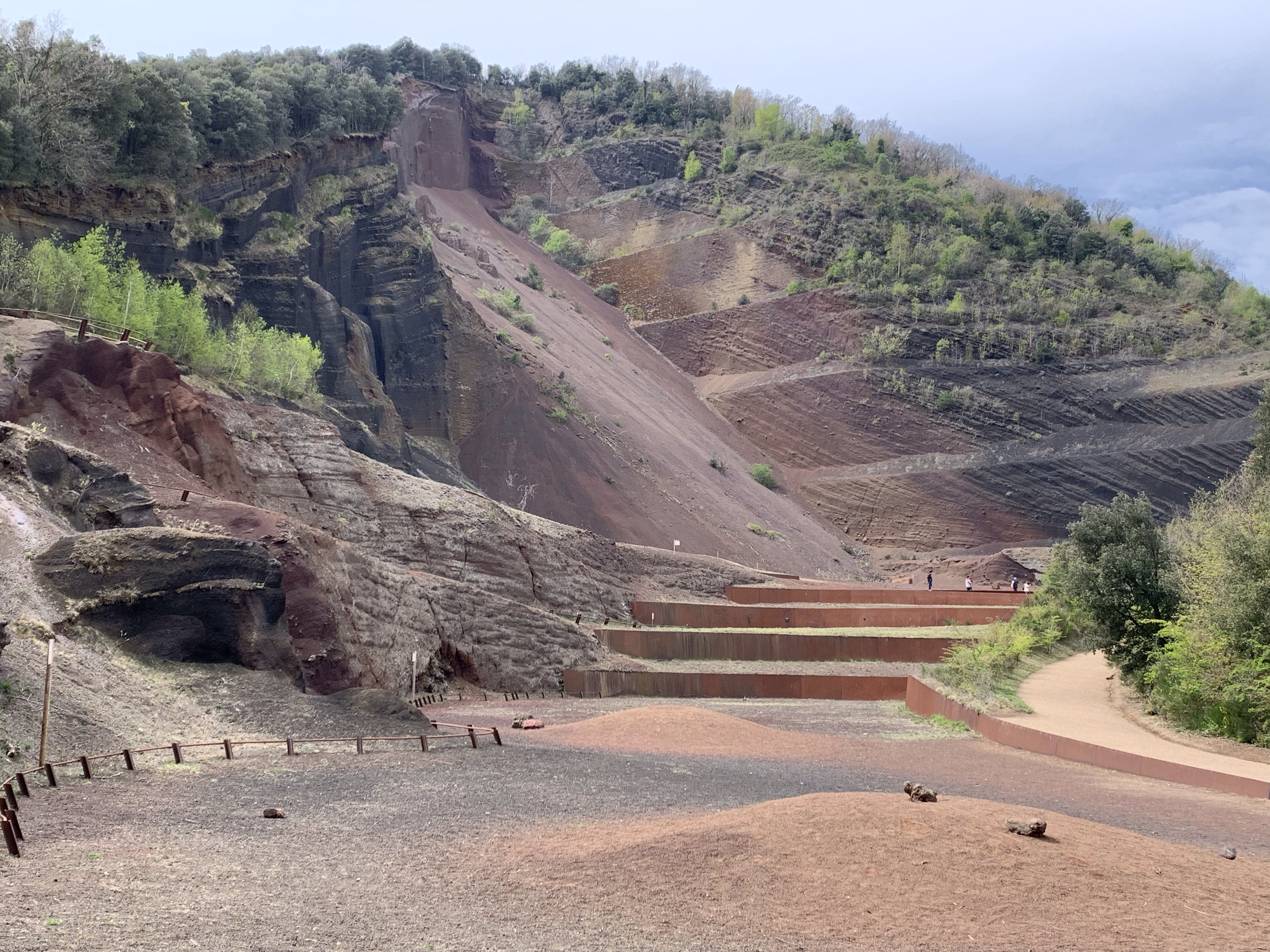 Si hasta ahora realmente no habíamos podido ver tierra volcánica debido a que la vegetación ha cubierto por completo lo que queda de los volcanes, aquí si que se puede ver claramente, quizás debido a que hubo una cantera que funcionó hasta finales de los años ’80, un grupo ecológico conjuntamente con la Generalitat ha conseguido cerrarla y reconvertir este espacio en natural protegido, un cartel el cual pone que pisar fuera de las zonas marcadas es susceptible de sanción de 350€ lo demuestra claramente.