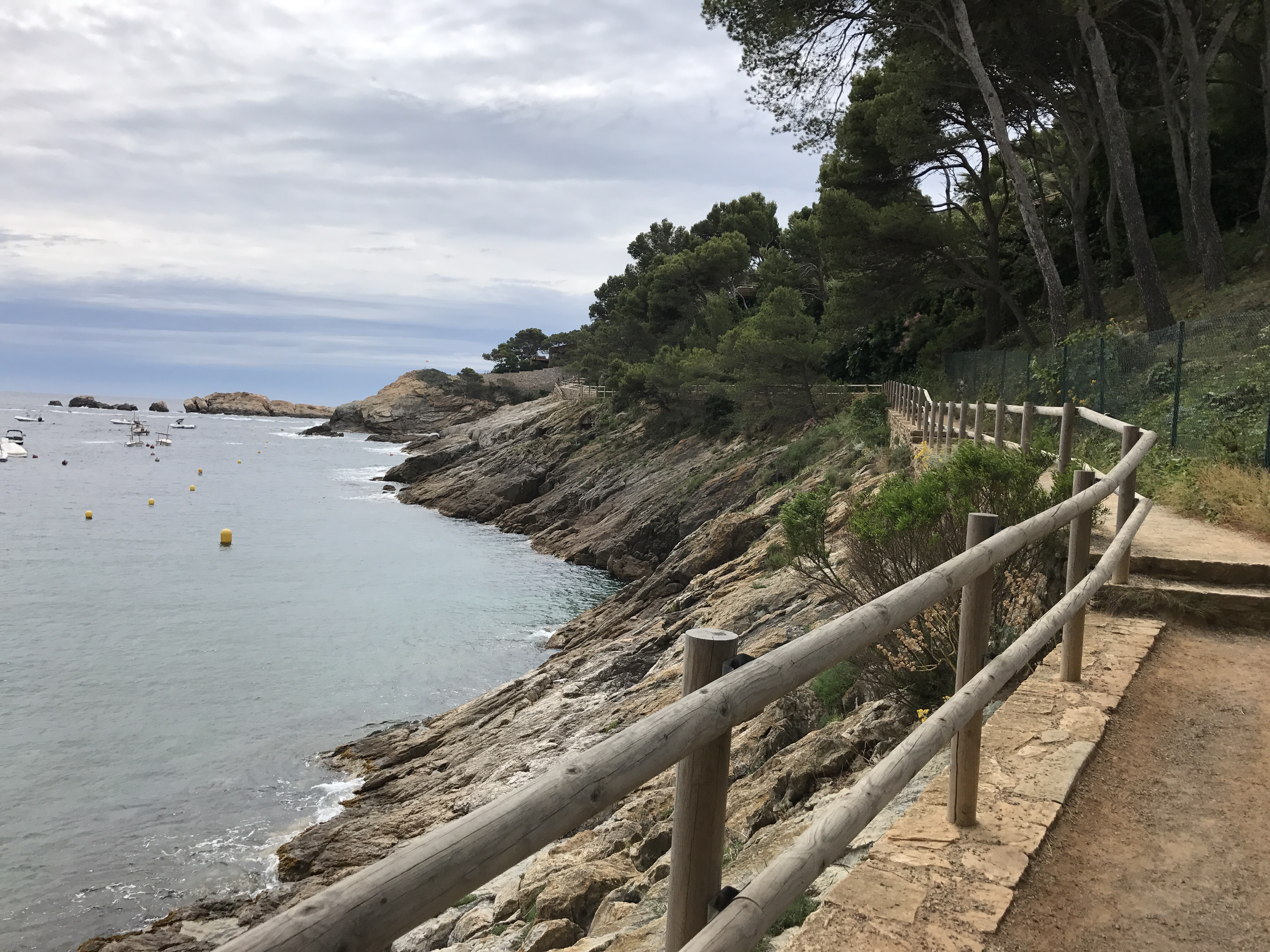 El primer tramo, dentro del término municipal de Llançà, es un sube y baja con acceso a diferentes calas y playas, el cielo está bastante nublado pero el sol está a punto de vencer las nubes o es lo que a nosotros nos apetece.
