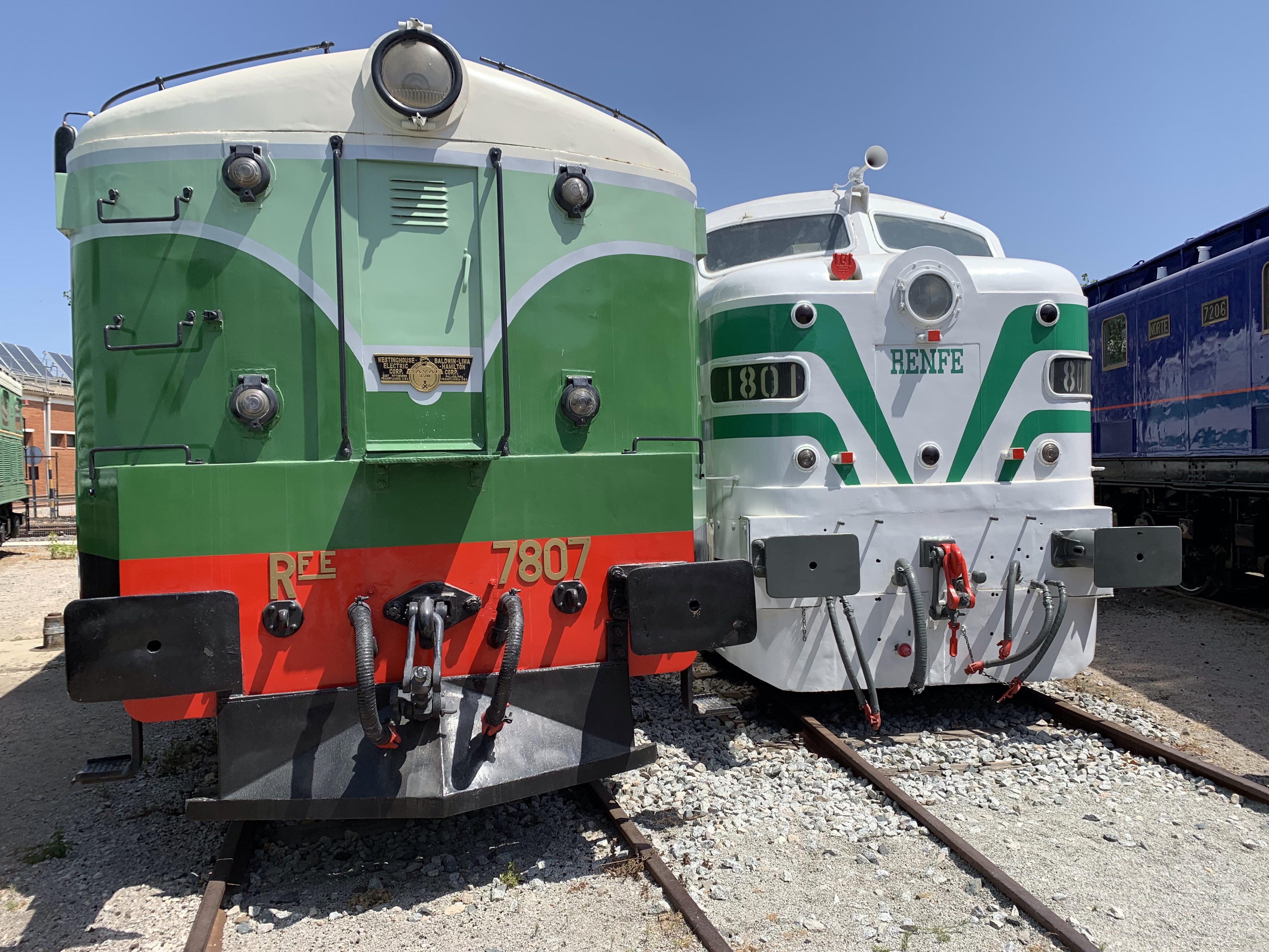 El acceso a las locomotoras es permitido así que aprovechamos y subimos en varias de ellas, una fotos por aquí, otra por allá y cómo el que no quiere la cosa de repente desaparece el techo y, siguiendo la exposición ordenada en forma de abanico, nos encontramos en el exterior, seguimos con locomotoras más recientes.