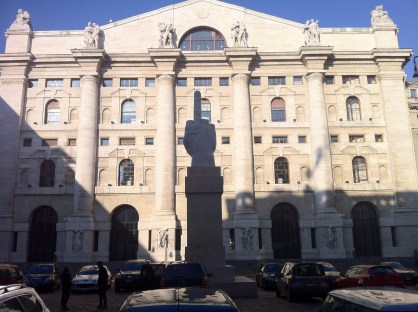 Gianni nos ha indicado que justo en la plaza de la Bolsa de Milán han puesto una extraña escultura de un dedo levantado así que allí que vamos y si, es el tercer dedo de la mano, exactamente como cuando alguien te corta el camino y tú lo levantas…