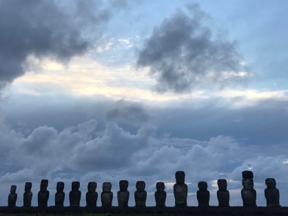 Bruna, nuestra guía de hoy, es una chica brasileña afincada aquí con pareja rapanui, arrancamos, charlamos y llegamos a Tongariki, justamente donde acabamos anteayer. Entramos en el área, nos posicionamos, ella saca unas mantas y luego nos ofrece un the, genial. El cielo empieza a clarear, no tiene pinta de que las nubes nos dejen ver un amanecer limpio pero ya que estamos intentaremos que sea lo mejor posible.