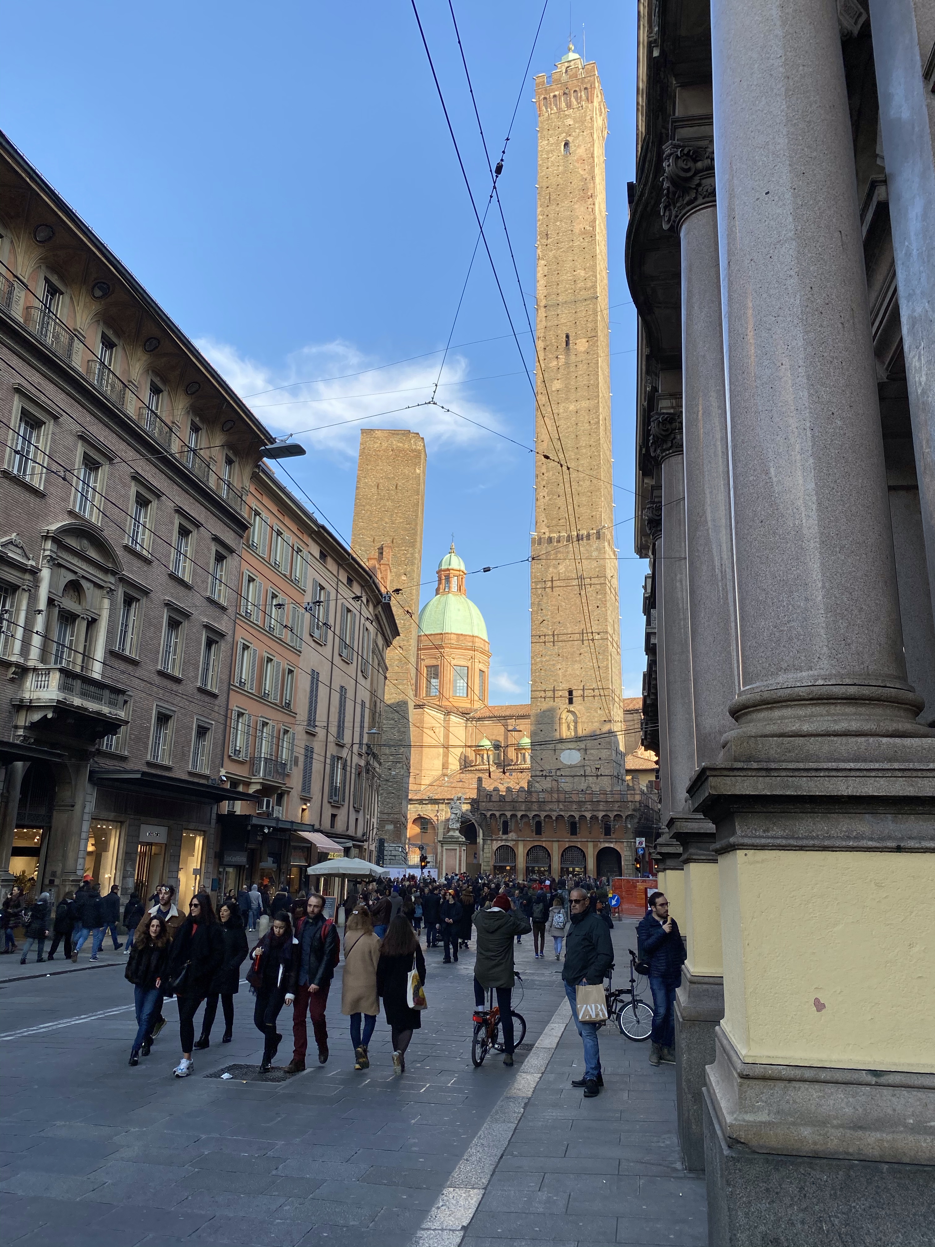 Mientras hablamos llegamos a nuestro siguiente destino: las Torres Asinelli y Garisenda. La primera es la más alta, mide casi unos 100m, la segunda mide poco menos de la mitad y fue recortada su altura debido a que el terreno debajo de ella cedió dejándola completamente torcida, aspecto que ofrece hoy en día. Breve pausa para que Ale desayune algo y nosotros aprovechamos para tomarnos un café.