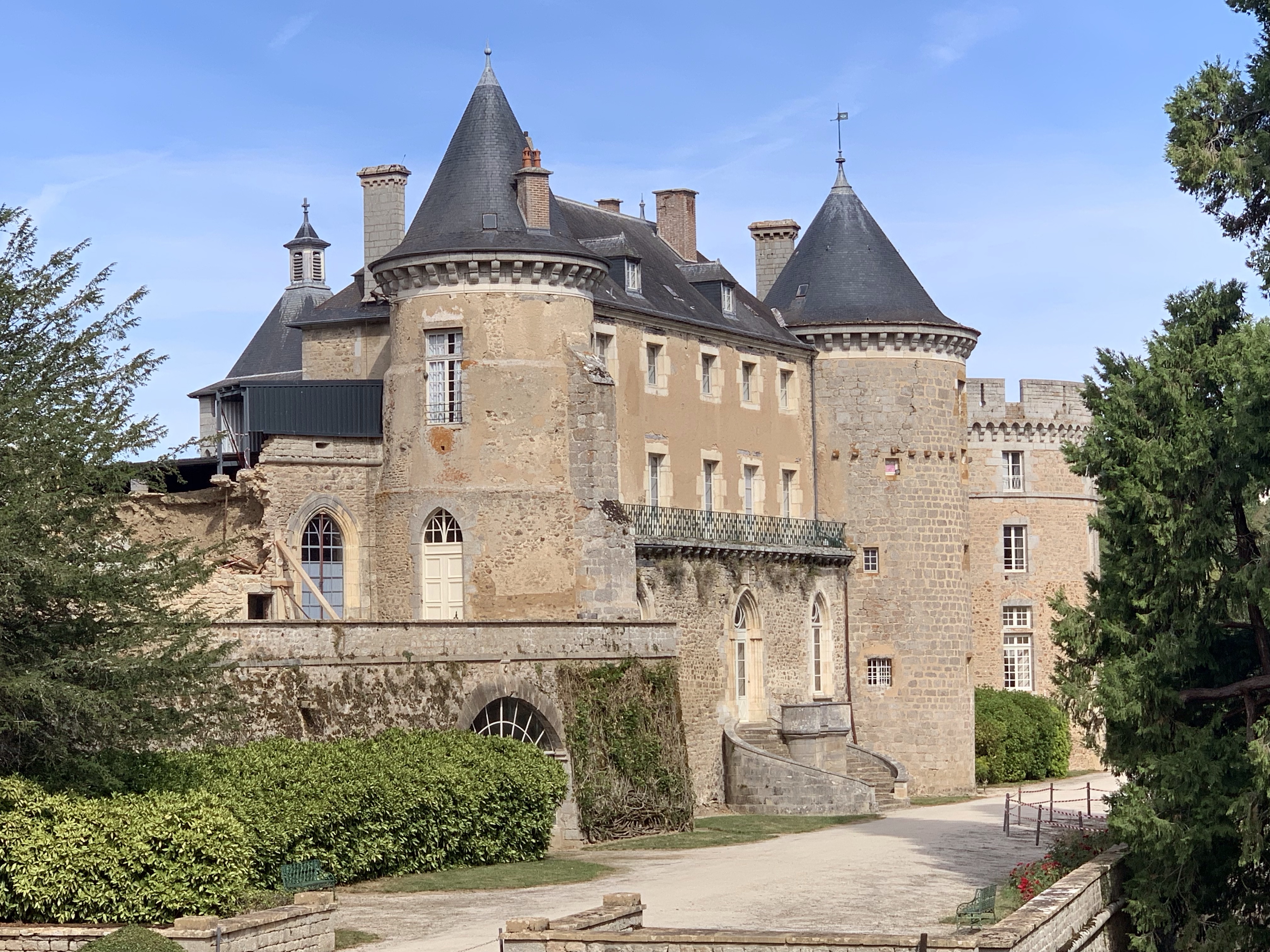 Conducimos con ausencia absoluta de tráfico en una carretera que nos lleva a un pequeño lago que bordeamos hasta llegar a un pueblo y, desde allí veo de reojo un castillo, en cuanto puedo doy la vuelta, una parada para sacar una foto desde aquella posición y, llegamos. Se trata del Castillo de Chastellux, en realidad se trata de un edificio que se está derrumbando, varias piedras están caídas, apuntalado en varios puntos. Debe de ser tremendamente caro poder mantener todo esto y, si no hay turistas, no hay ingresos.